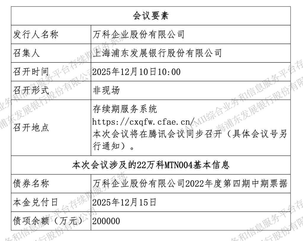 此次会议召集人为上海浦东发展银行股份有限公司,召开时间为2025年12月10日。本次会议涉及的22万科MTN004本金兑付日为2025年12月15日,债项余额20亿元,计息期债项利率为3%,存续期管理机构为上海浦东发展银行股份有限公司。